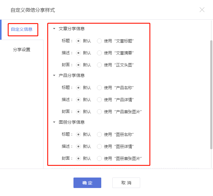 同时支持自定义文章、产品、图册分享信息,包括标题、描述和封面。