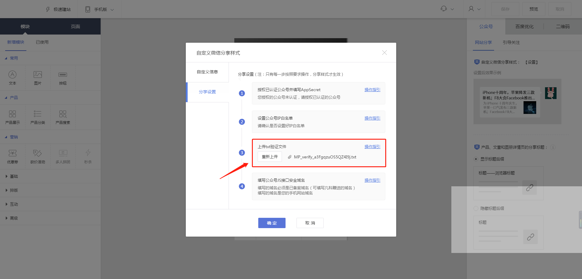 4.5.4、将下载的文件上传到凡科网后台的手机版—推广—公众号—网站分享—自定义微信分享样式—分享设置—上传txt验证文件里,确定保存。
