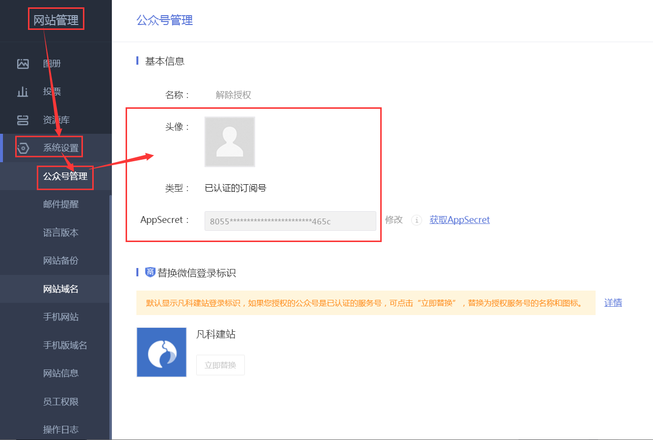4.3、点击手机版左上角的“网站管理”,在系统设置—公众号管理里授权已认证的公众号,并填写AppSecret。(如何获取AppSecret?请看接下来的步骤4.3.1~4.3.3)